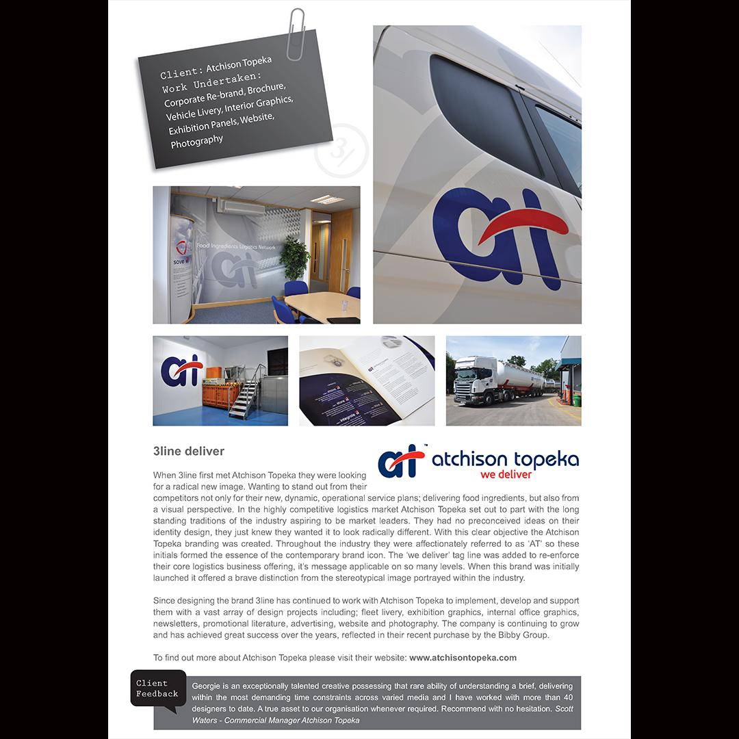 Rebranding undertaken for Atchison Topeka. This was a great project to work on incorporating redesign of the identity, implementation of the brand across everything from clothing to site signage, literature and interior walls across their site and fleet of vehicles.
